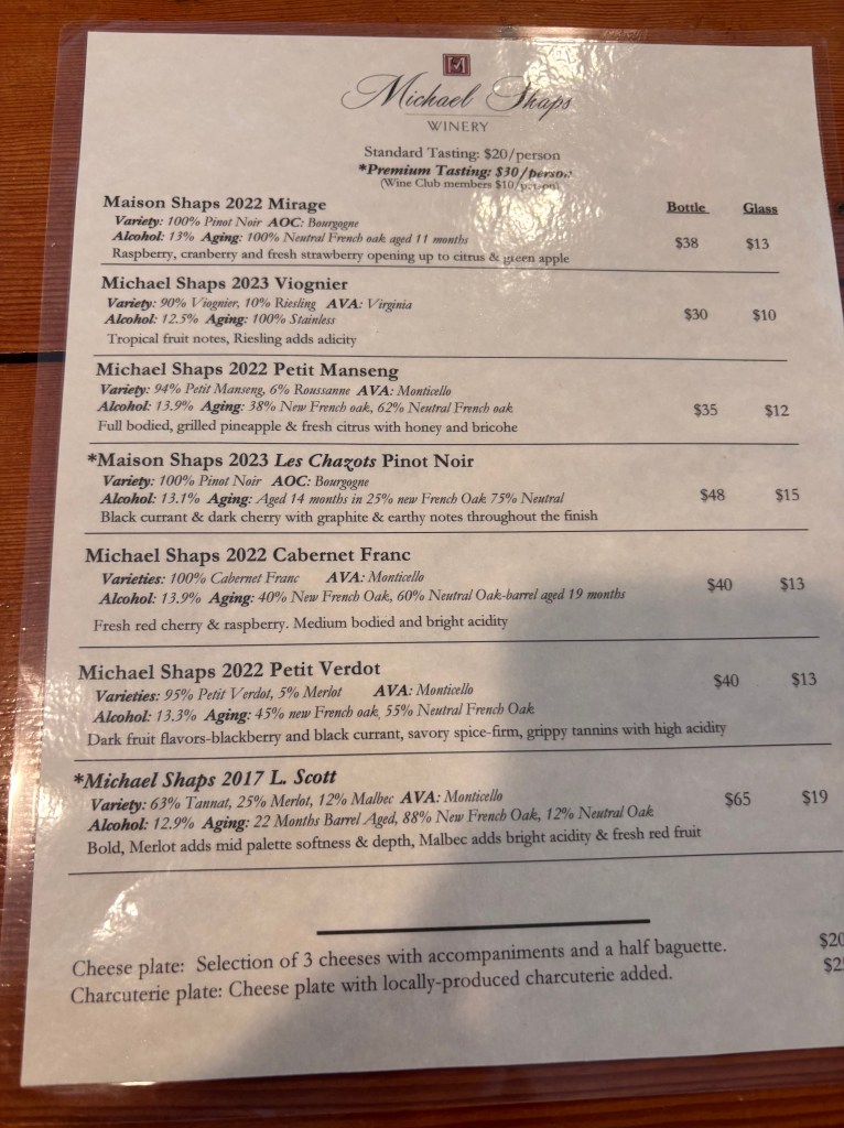 Our tasting began at the bar and was led by Theresa and Alayna, who were both very welcoming and knowledgeable (Alayna is studying for her WSETs). And by welcoming, I mean not only friendly and personable, but very patient with my many questions. I don’t know about you (probably b/c we have never discussed this), but I much prefer receiving “led” tastings at a winery versus receiving a flight to take back to a table to explore by yourselves. I feel like this allows for a more interactive experience, allowing you to learn more information about how the wine was made and other interesting tidbits. I digress – back to the tasting. Michael Shaps is a bit unique in that they not only produce wine grown and produced in Virginia, but they also own a winery in Burgundy, France (Maison Shaps). And that is where our first wine was from – a very unique wine that you do not see very often – a white Pinot Noir! It was definitely not your normal white wine – a much fuller body, a bit of tartness with some raspberry and cranberry flavors. Very enjoyable. We then progressed through the rest of the tasting (see below). I enjoyed being able to go back and forth between the Virginia and French wines. And while all the wines were enjoyable, our favorites were the Mirage (white Pinot Noir) and the Cab Franc. I would also give a shout out to the Petit Verdot – while this is not my favorite varietal by any means, this particular one was very nice.