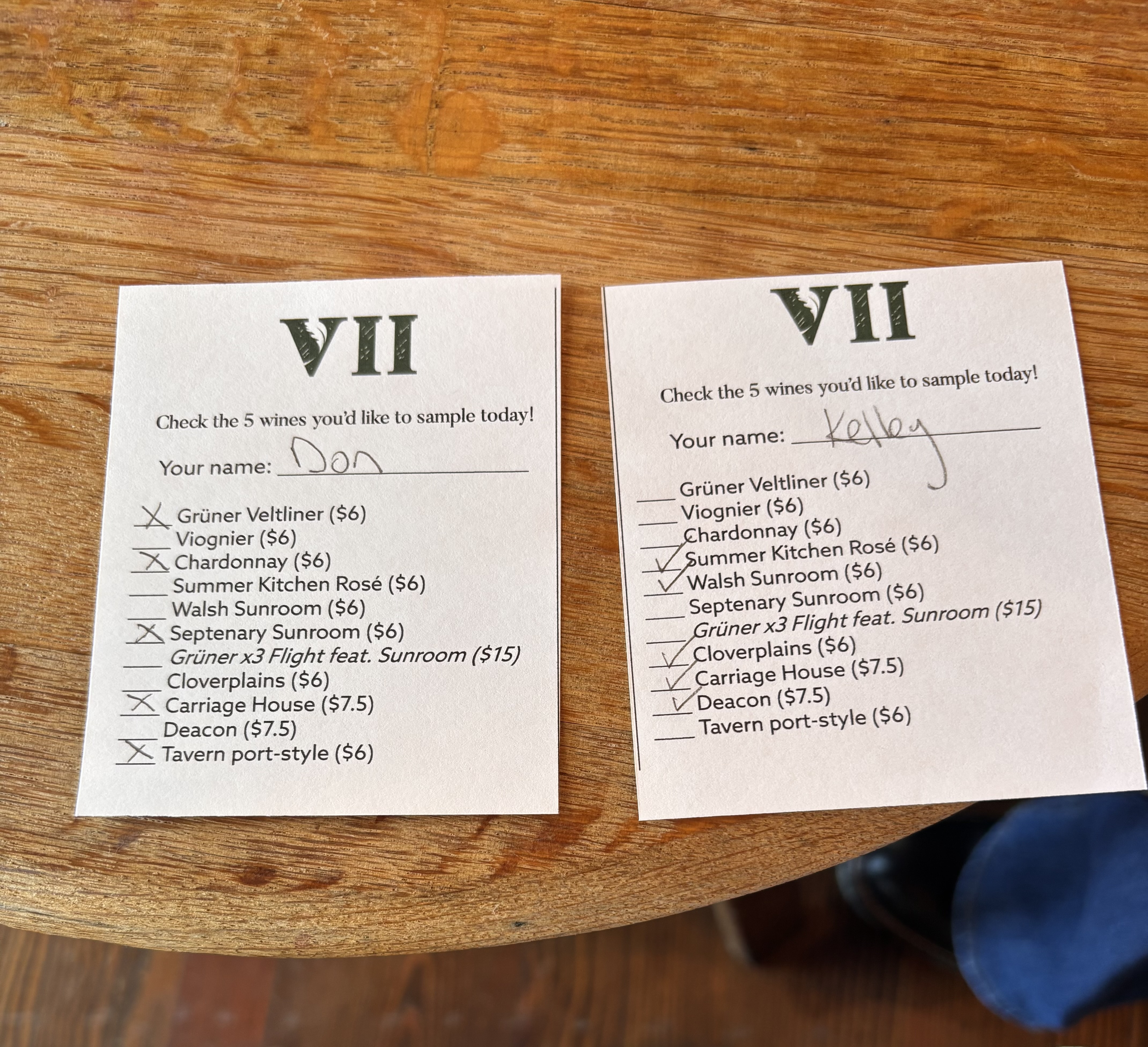 As we were not rushing on this “get-away” day, we stayed for a glass and a nice charcuterie board while trying to figure out our next stop. Theresa and Alayna both offered plenty of suggestions, as did the nice couple to the side of us also receiving a tasting. After much discussion, sipping and nibbling, we left with bottles of the Mirage and Cab Franc and headed for our next stop, Septenary Winery.