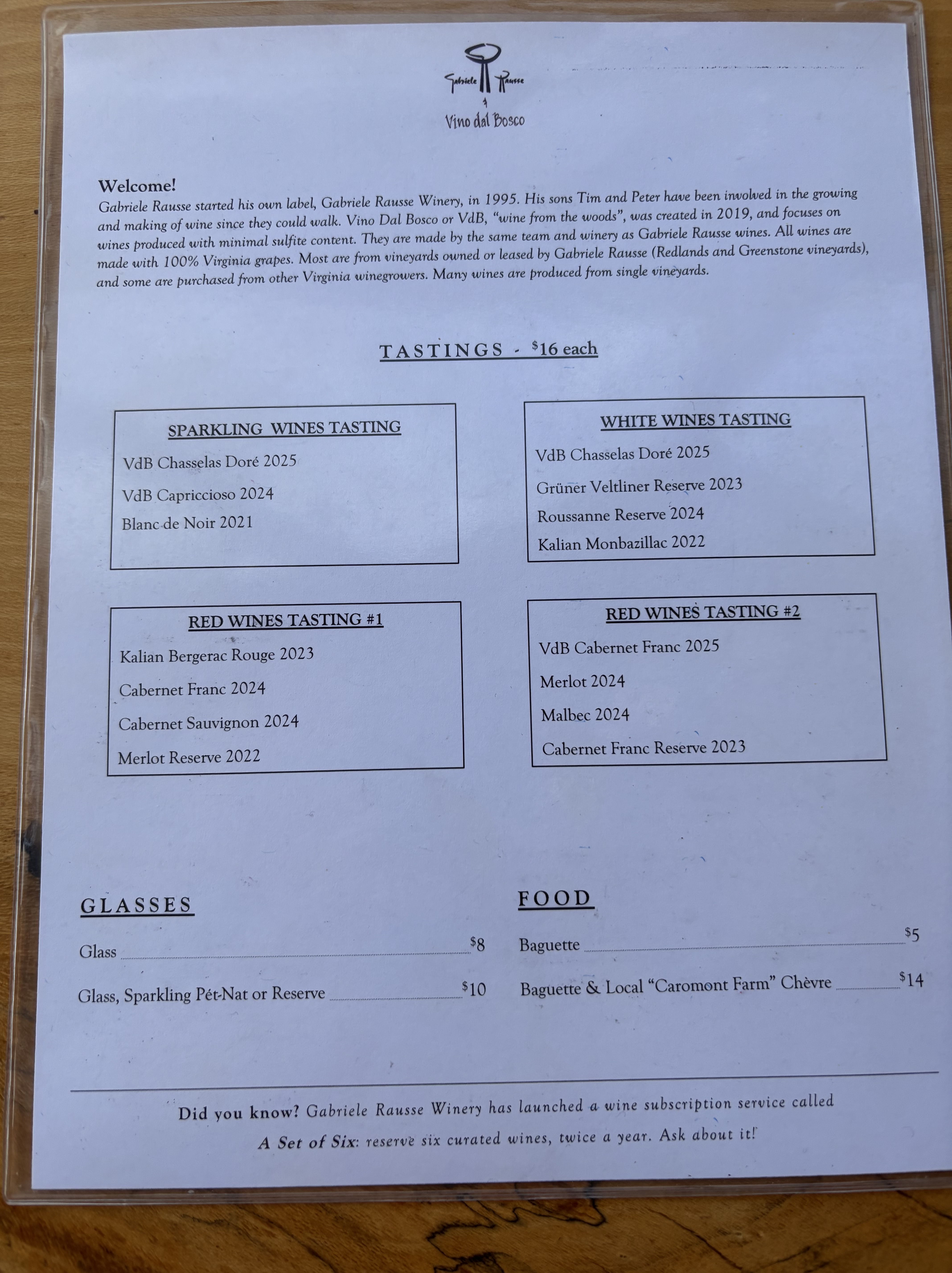 After a good night’s sleep and a bagel breakfast, we had one more stop to make before we began our trek home. And that stop was Gabriele Rausse Winery. Just like Michael Shaps, Gabriele Rausse has had a tremendous impact on the growth of wine in Virginia. He was involved in the founding of Barboursville Vineyards and has gone on to assist many other Virginia wineries, including Blenheim, Afton Mountain and Jefferson Vineyards before opening his own winery in 1997. So once again, we were eager to taste the wines of such a giant in the Virginia wine community. And once again, they did not disappoint. One of the most interesting wines to me was the VdB Cabernet France 2025 – I was shocked that a 2025 wine was ready for drinking and upon inquiring was told that it was aged for only 3 months and was intended to be drunk young. And so it was! It had beautiful fruit expression and was very easy drinking – perfect for pairing with a midweek meal or an impromptu get together. In the end, we left with a bottle of the 2024 Cab Franc, but once again enjoyed all the wines.