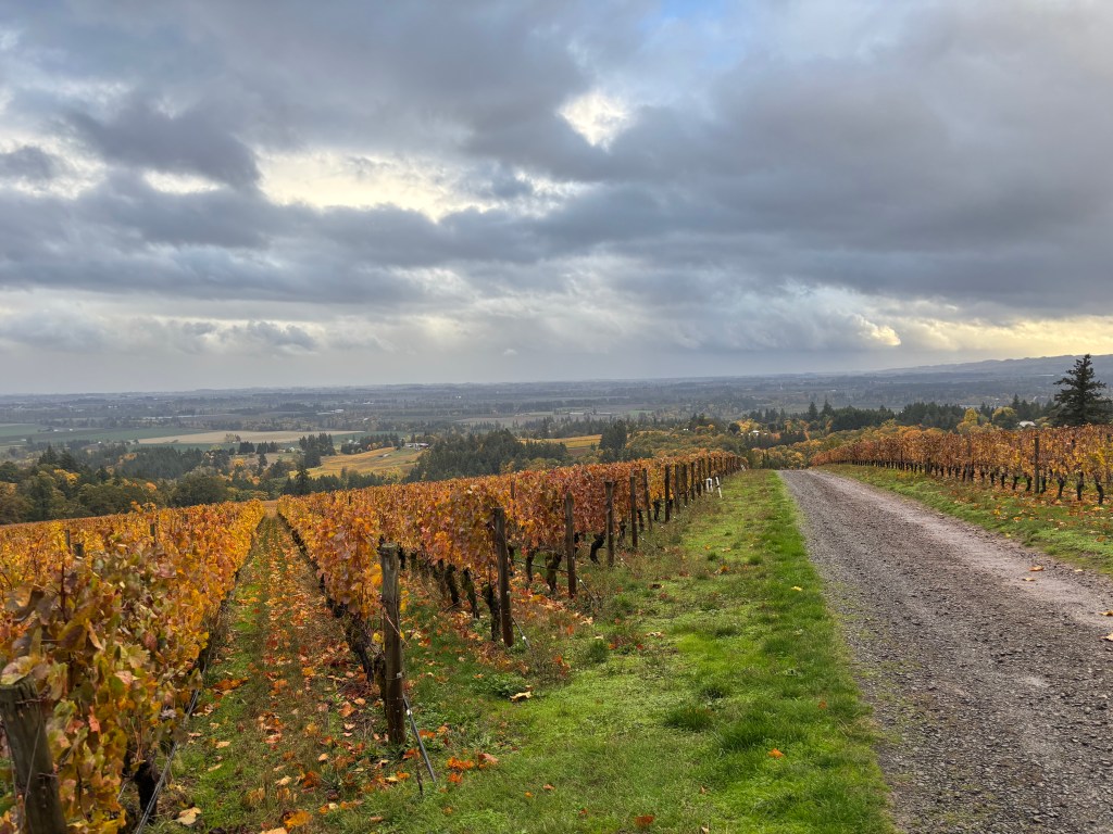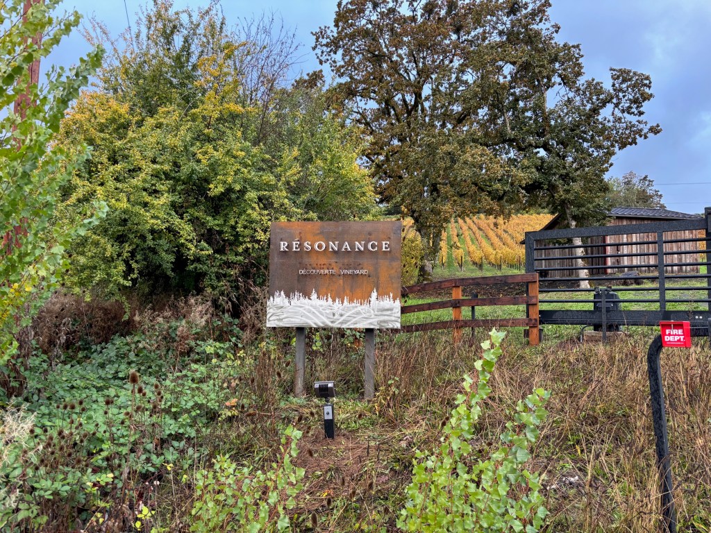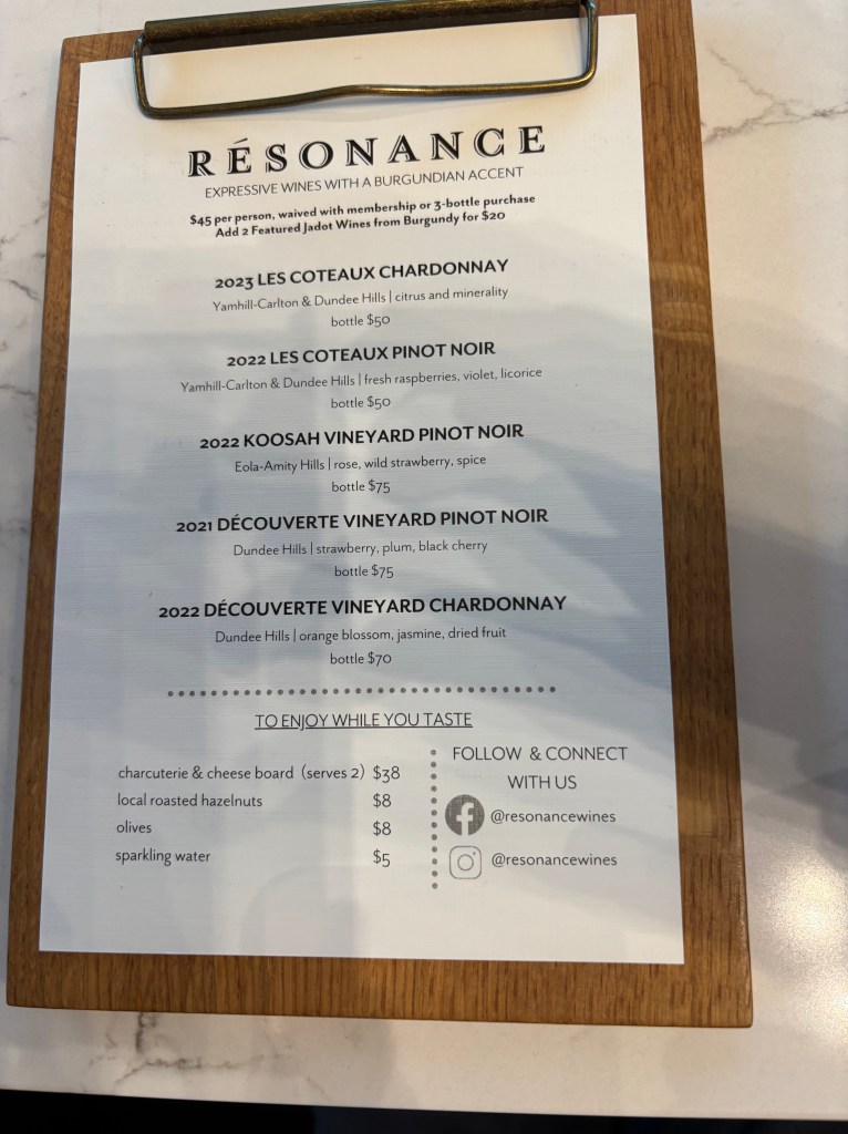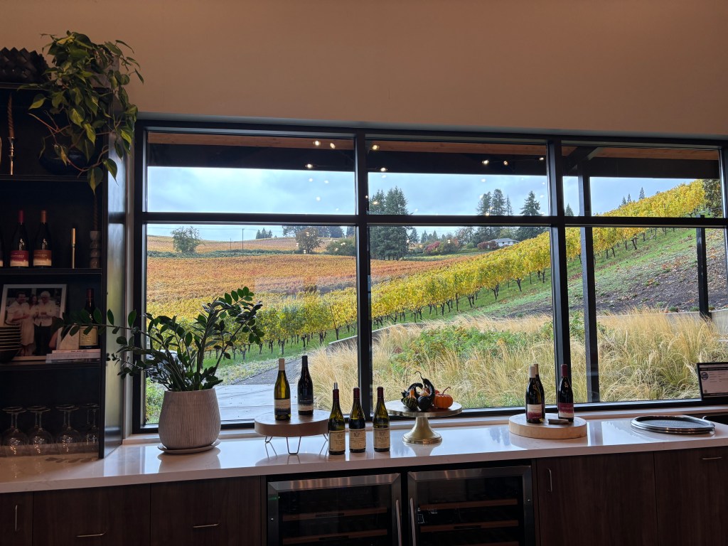 Our first stop in Willamette (after both flying into Portland Saturday morning) was at Resonance Wines (https://resonancewines.com/). Driving into Willamette (specifically the Dundee Hills part of Willamette) is a very pretty drive. As you drive up the main road(s) the wineries are located on, you pass by all off the vineyards on slopes/hills that produce the wine you are about to taste. Given that we were a bit later in the fall, most of the vines had already been harvested and the vine leaves turned colors to a beautiful golden yellow. As picturesque as one could hope for. The tasting room at Resonance was a bit on the small side but very cozy and intimate. And there was additional outdoor seating that would have been an option if we had been in a tad bit warmer weather. We were immediately greeted by Shane who asked if we would like to taste some wine to which we eagerly agreed. Despite having a large group to take care of as well, Shane gave us excellent attention and plenty of information about their wines. We started off with a basic tasting ($45/person) which included two of their Chardonnay’s and three of their Pinot Noirs. Shane (who we found out had spent a good amount of time in Northern Virginia, small world) explained the difference between the Pinot’s, as they came from different vineyards – two from Dundee Hills and one from Eola-Amity Hills. Shane set the standard that was followed throughout our time in both Willamette and Walla Walla – very knowledgeable not just about the wines at his winery, but also about the entire Willamette area and other wineries. When we completed our initial tasting, we were offered the opportunity to also try wines from Resonance’s Burgundy owners, Maison Louis Jadot (this cost an extra $20). We happily agreed and it was interesting to compare the Burgundy and Oregon wines side by side. After finishing the Louis Jadot, it was time to move on to our next stop, which was a long 5 minutes away.