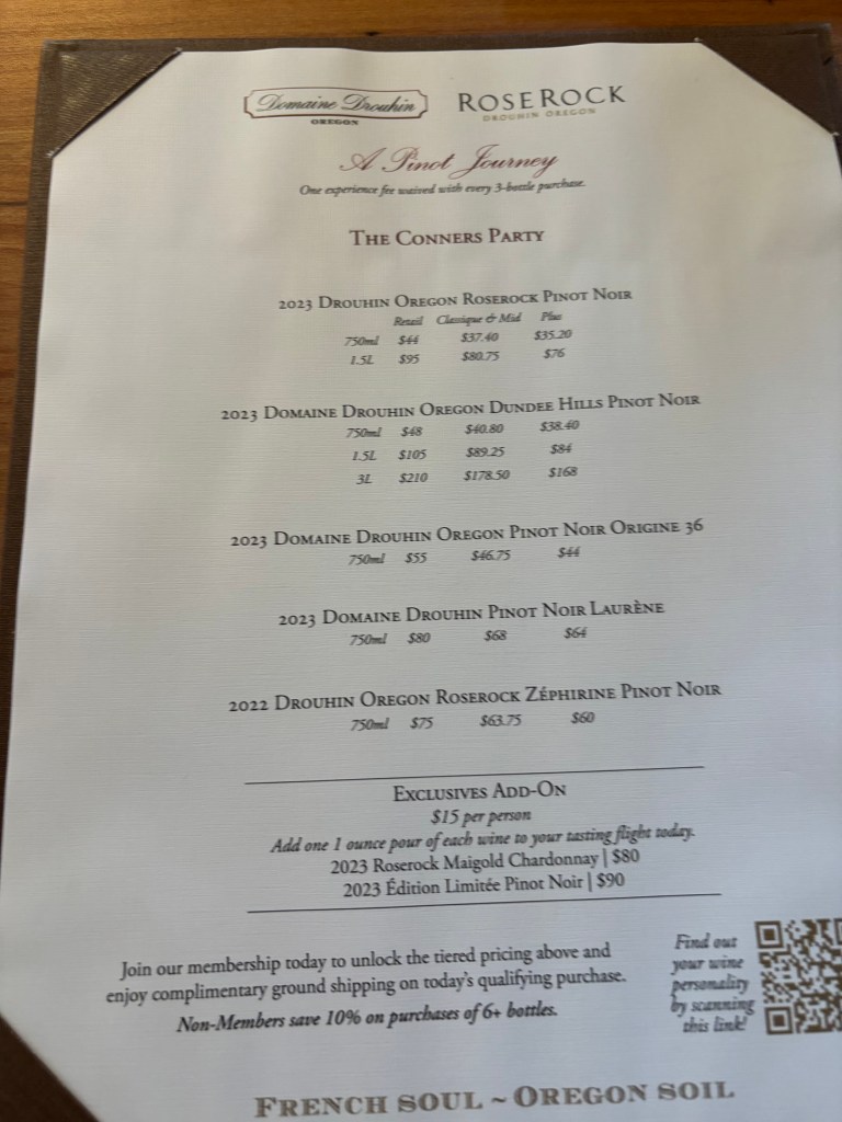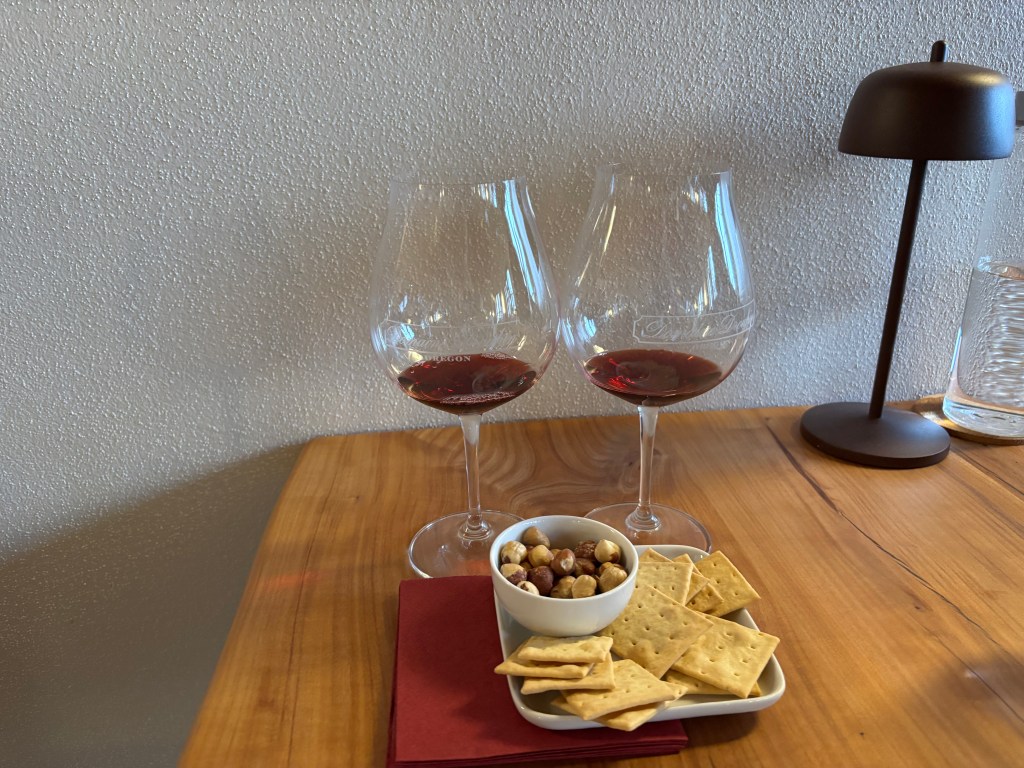After a complicated drive of two right turns and 2.2 miles, we arrived at Domaine Drouhin (https://domainedrouhin.com/), a top name in Willamette Valley. Domaine Drouhin also has Burgundy roots, having been founded in 1986 by Robert Drouhin, whose family produces several Burgundy Grand Cru’s and Premier Crus. Having made a reservation, we were immediately seated and Jasmine quickly came by to start our tasting. Drouhin offers multiple types of tastings – The Oregon Experience, which allows you to try their Oregon Pinot Noirs and Chardonnay’s ($40/person), A Pinot Journey, which gives you a larger selection of just Pinot Noirs for your tasting ($50/person) and lastly, The 1880 Connection, which allows you to do a side by side comparison of their Oregon wines (Dundee Hills and RoseRock) with their Burgundy wines (Pinots and Chardonnays), for $60/person. Given that we are more inclined towards red wines, Mrs. Chump and I chose the Pinot Journey and eagerly anticipated our first wines. To go along with the wines, Jasmine also brought out some crackers and hazelnuts (I’ve smelled them in coffee beans but had never tasted one) for us to snack on while we tasted. For our tasting, we received three wines from their Dundee Hills vineyards, including their well-known “Laurene” wine, as well as two wines from their RoseRock vineyards, including their Zephirine wine (RoseRock vineyards get a bit more wind off the ocean so tend to have a bit more salinity in them. All I know is we liked the RoseRock wines ), It was nice to see them give us a wide variety of their wines, both from different locations and a variety of price points. Jasmine, our host, was very helpful in educating us on the differences between the sites and giving us clues on what to look for when tasting the different wines. When we had finished with the original tasting, she also offered to let us taste two of their Burgundy wines, both of which were Premier Crus (in Burgundy, the highest classification is Grand Cru, followed by Premier Cru and then Villages, so these were pretty good wines). In the end, we enjoyed what we tasted enough that we purchased six bottles to ship home. Jasmine gave us some recommendations for dinner and we were happily on our way to our hotel, aptly named The Dundee Hotel. But more on that later, this has gone on long enough.