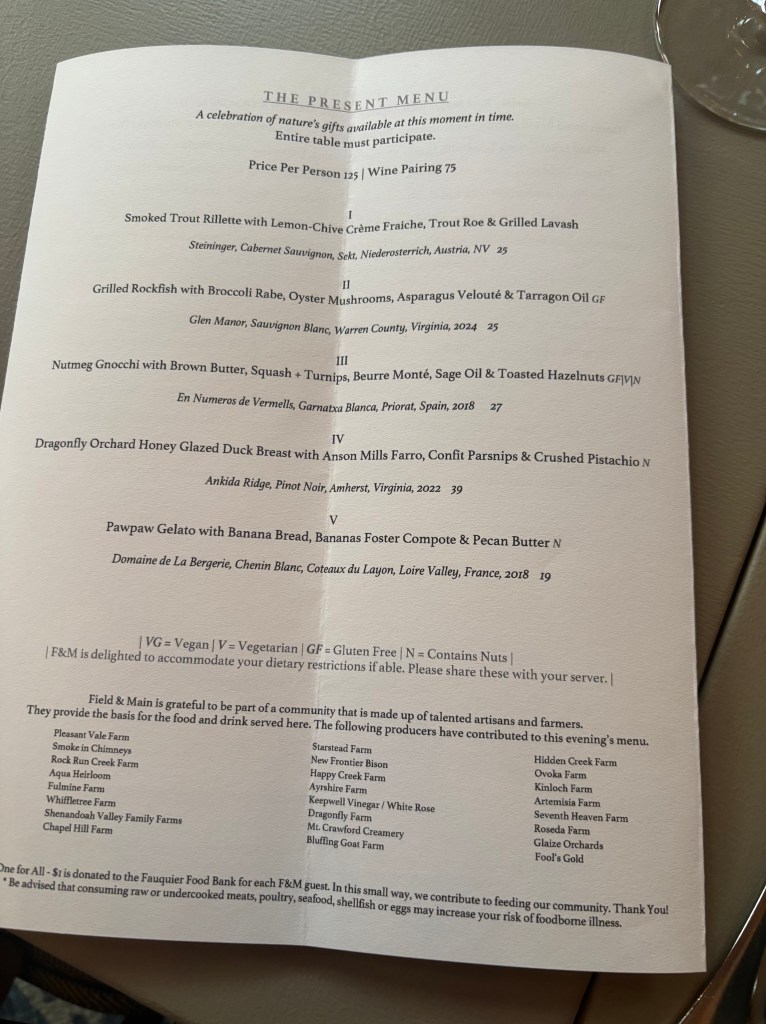 In order to celebrate this momentous occasion, we decided to splurge on a nice dinner and chose Field and Main for our destination. Neither of us had ever been there before though we had both of heard it through different channels. We were both excited knowing it had received several awards for both its wine program overall (2026 James Beard semi-finalist) and its noted support of Viriginia wines. It will come as no surprise, therefore, that we chose their “Present” menu – a five-course meal with an available wine pairing option, that we obviously chose to partake in.