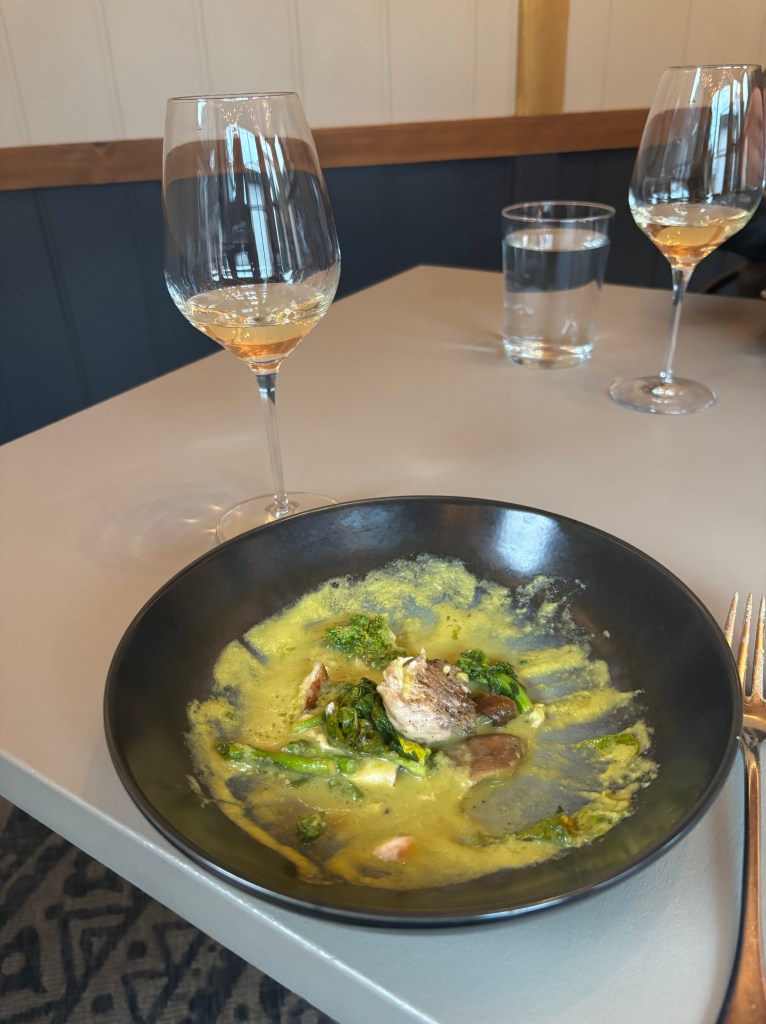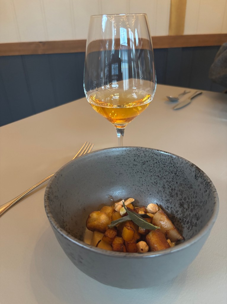 Course 3 brought perhaps the most interesting wine of the night for me – an 8-year old Grenache Blanc from Priorat, Spain. Paired with a Nutmeg Gnocchi in brown butter, the wine arrived a beautiful golden color and had a surprisingly full-bodied feel to it. While we enjoyed it on its own, once we took a sip after enjoying a taste of the gnocchi, it was absolutely amazing.