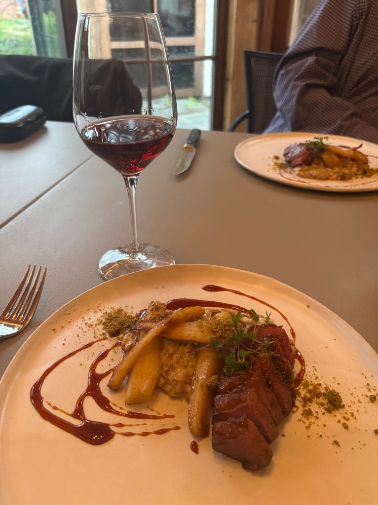 Dish #2 was a delightful Rockfish, with broccoli, oyster mushrooms and asparagus velouté, paired with a Virginia wine, Glen Manor’s Sauvignon Blanc. Anyone who has known me over the past 54 years will know my aversion to absolute hatred of mushrooms. Yet, with the help of wine, I am beginning to overcome. Both the dish and wine were delightful in their own sense, but when paired together they were both elevated. Which was a bit of a theme for the evening. The food and wine pairings were absolutely magnificent and seemed to raise the enjoyment of each on every course.